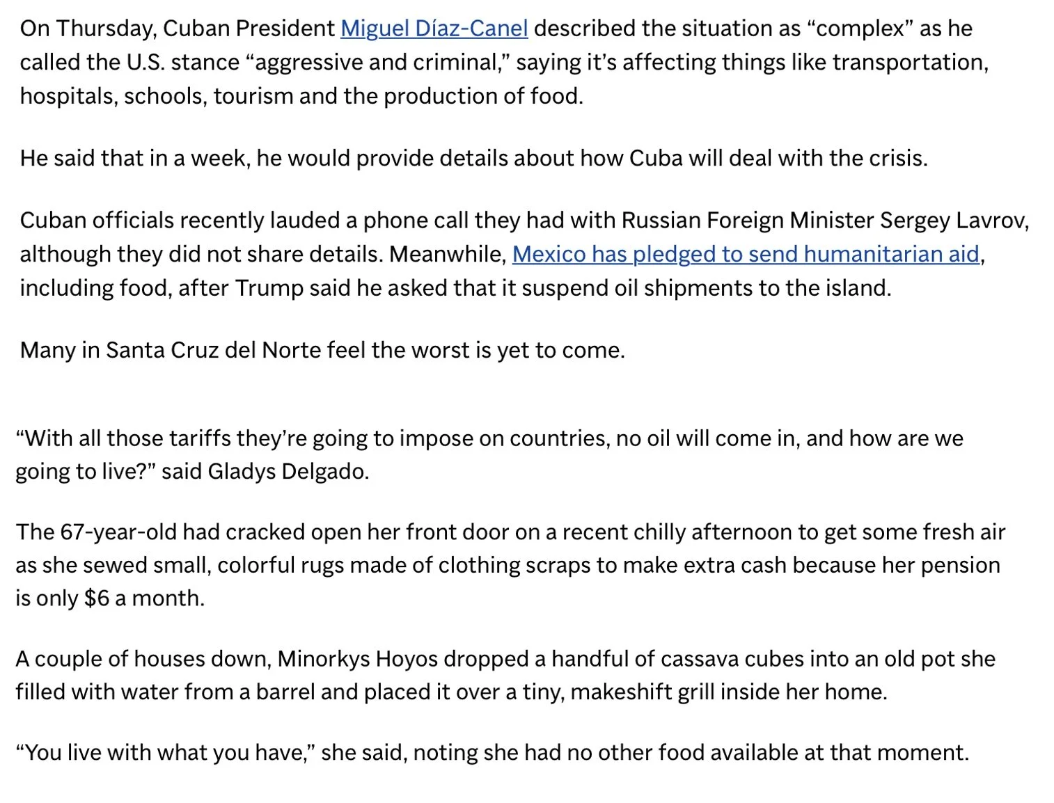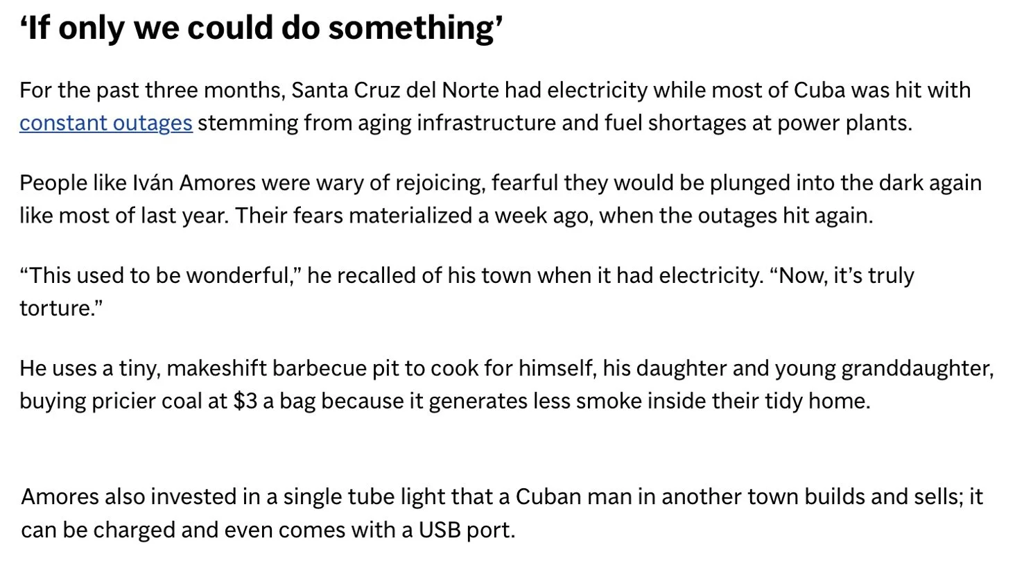 Today, the Associated Press published an article highlighting how the lack of reliable electricity is affecting everyday life across Cuba. You may read the article below or directly on their website. You can read it here